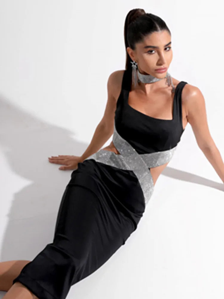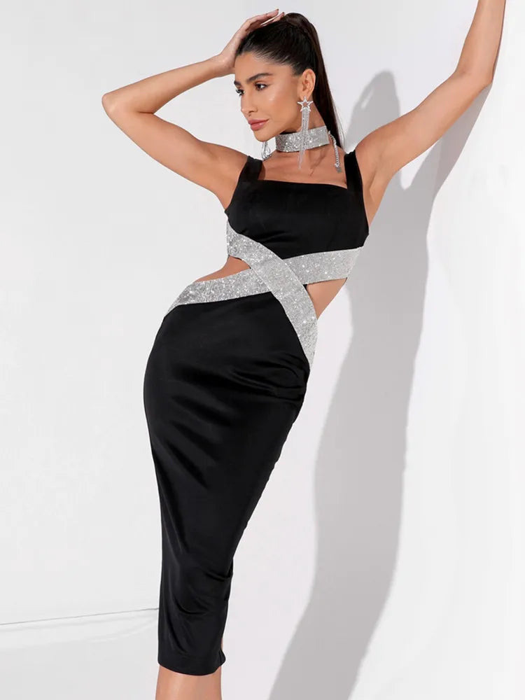 Chloe Enigma Sexy Backless V Neck Cutout Diamonds Black Dress 2024 Elegant Evening Club Party Dress - Celestial Couture