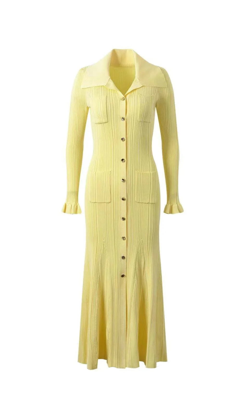 Rib-Knit Fluted Midi Shirt dress in yellow