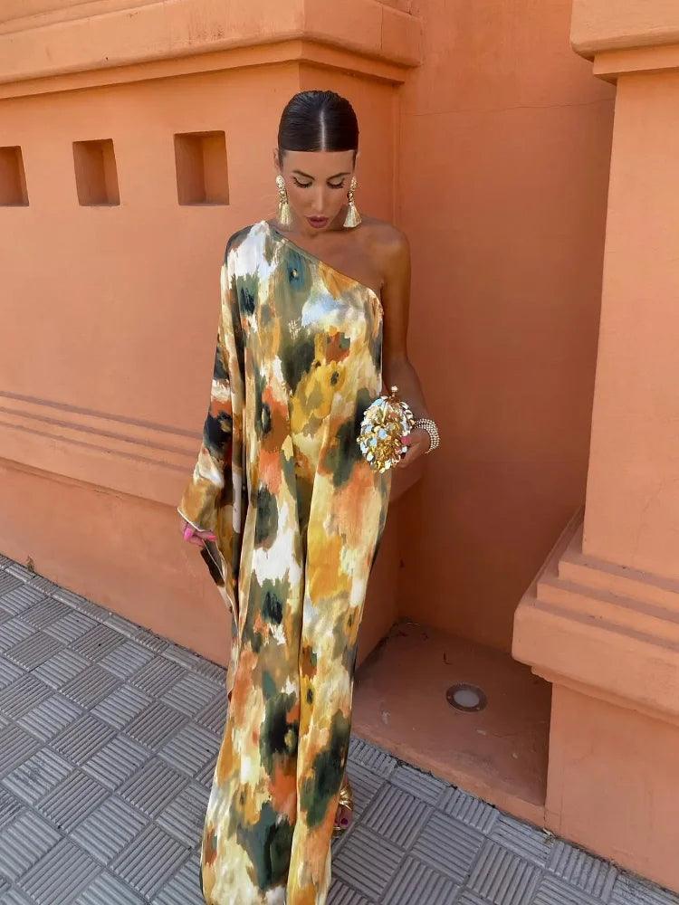 Striped Contrasting Oblique Shoulder Women's Sundress 2024 New Asymmetric Sleeves Long Dress Ladies Summer Party Evening Clothes