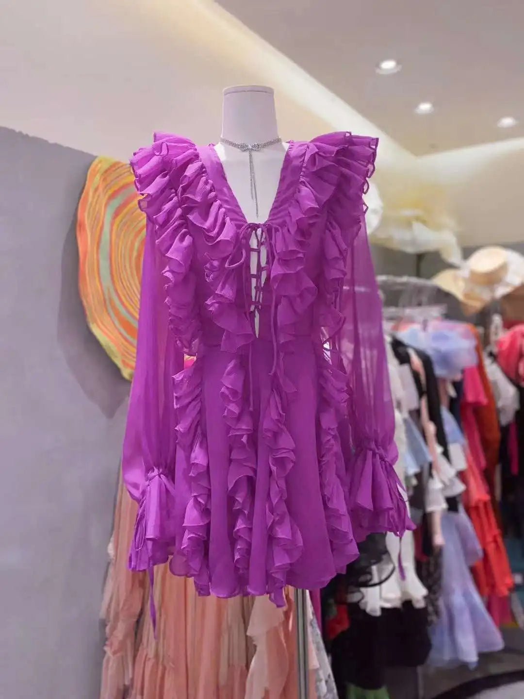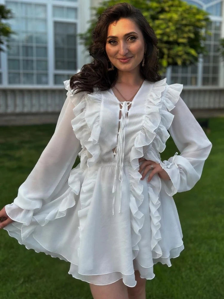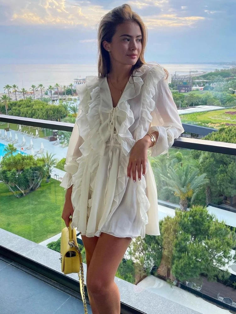 Women's Sheer Lace Mesh Deep V Neck Ruffle Bandage Dress - Elegant and Sexy Oversized Cover-Up