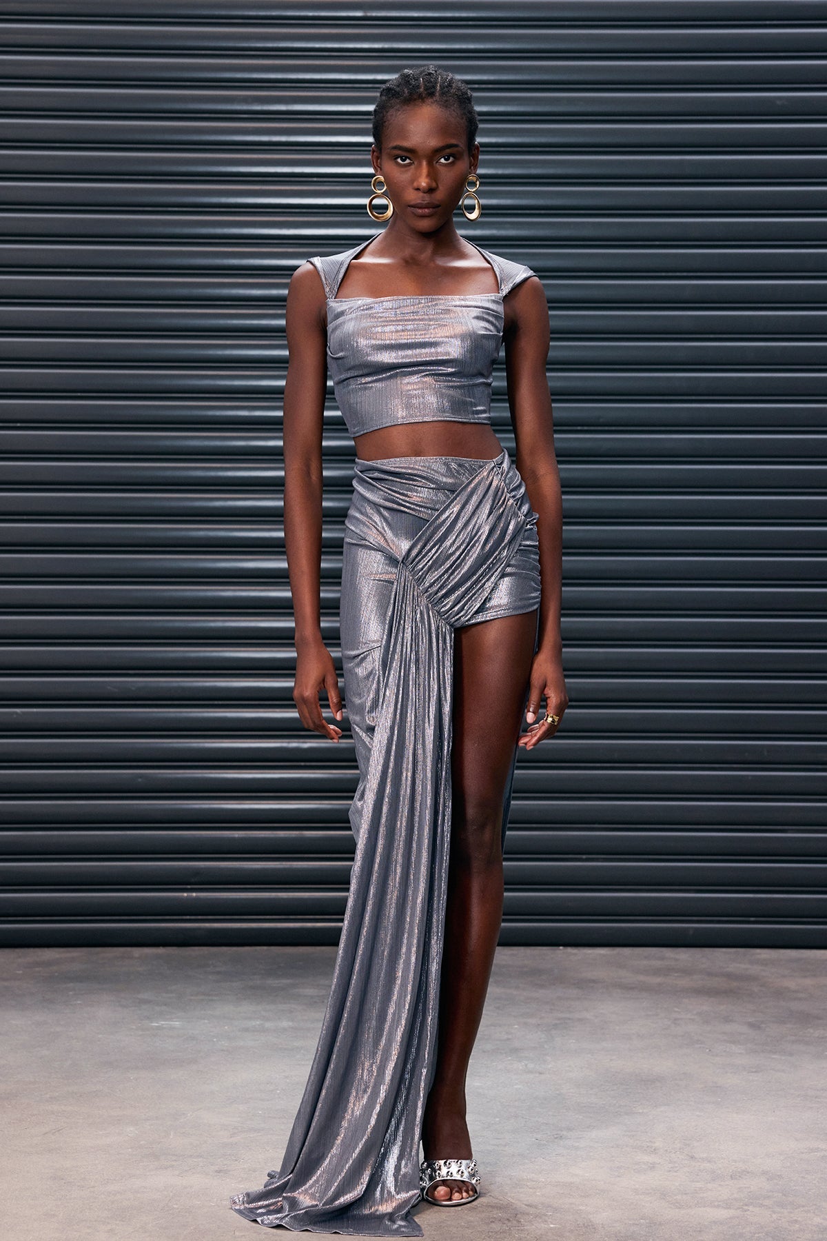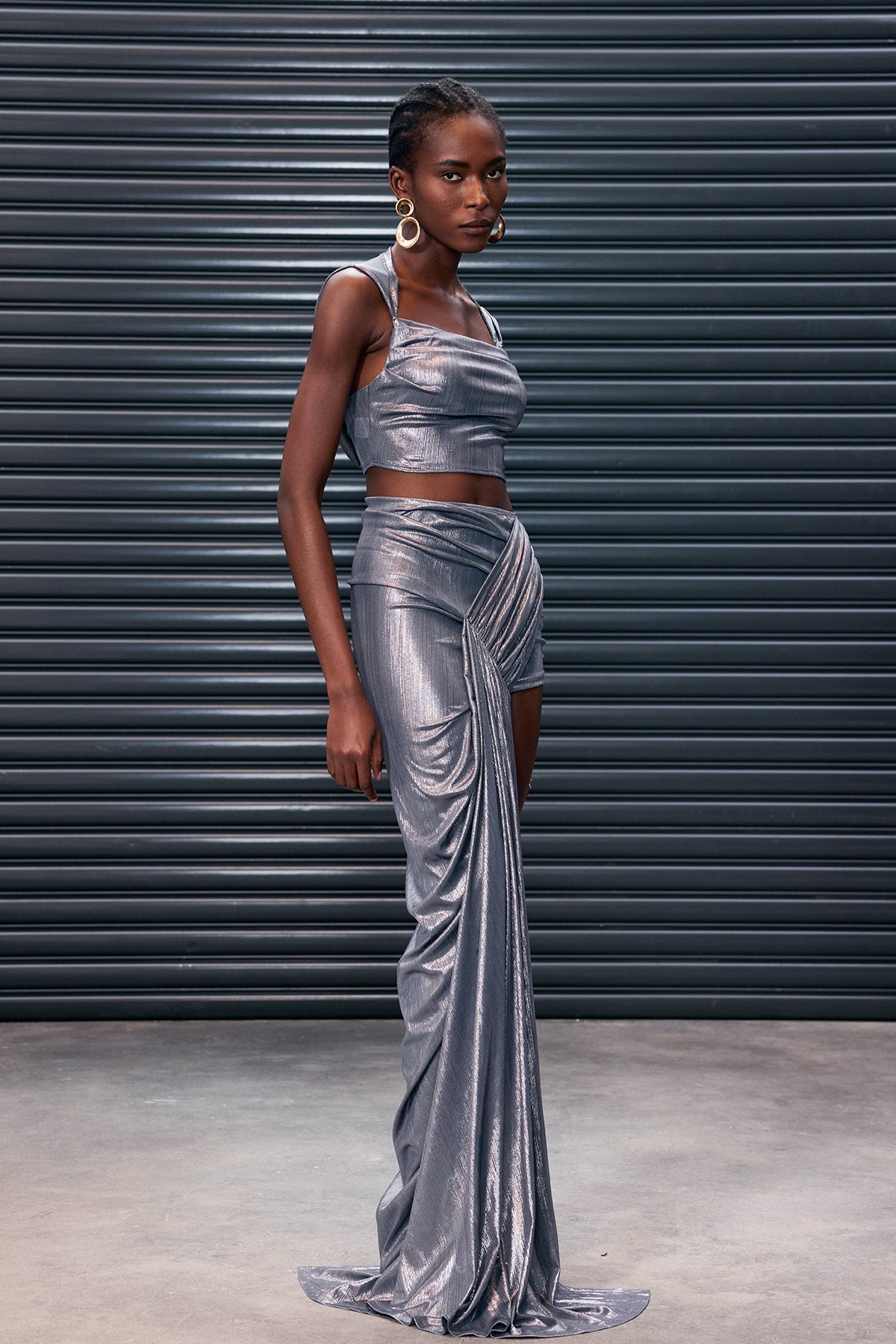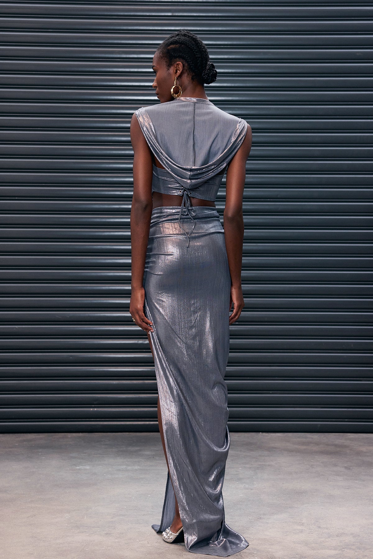 Anuradha Metallic Hooded Ruch Lace Up Skirt Set