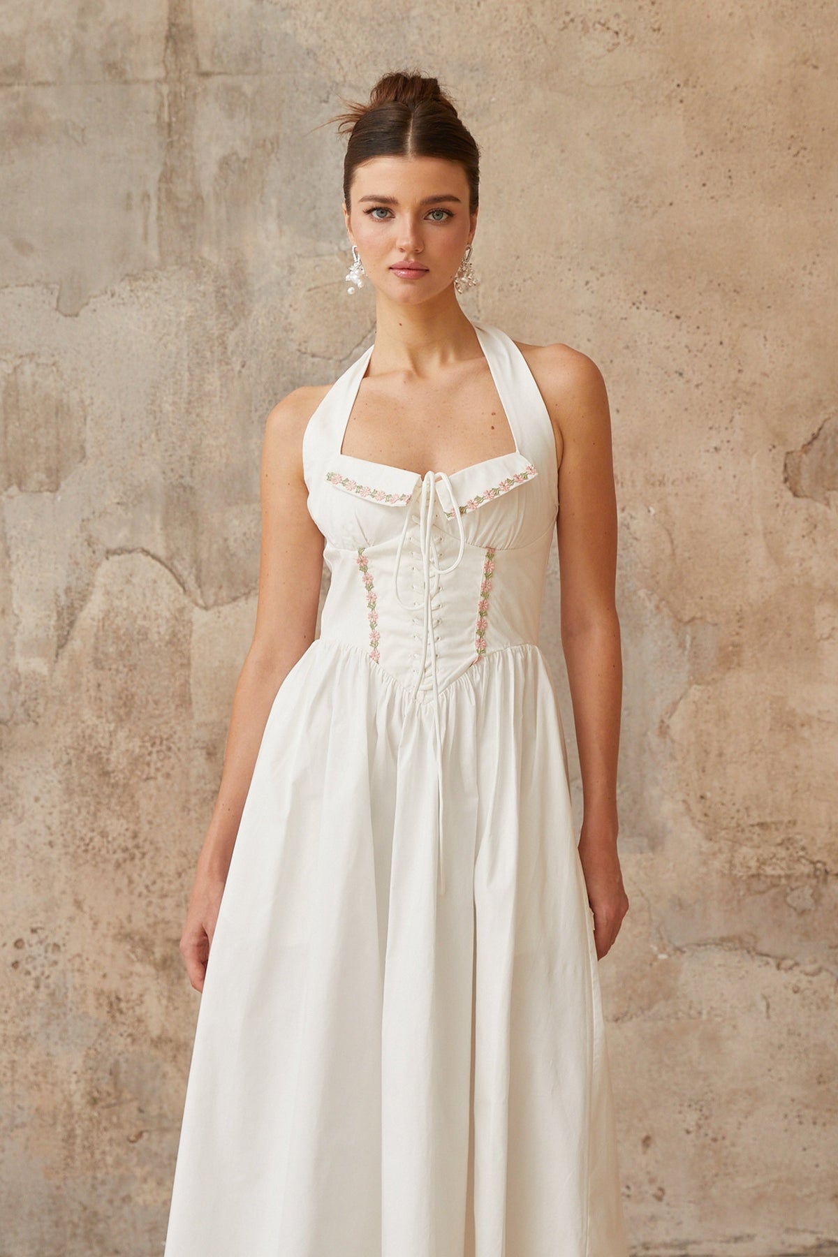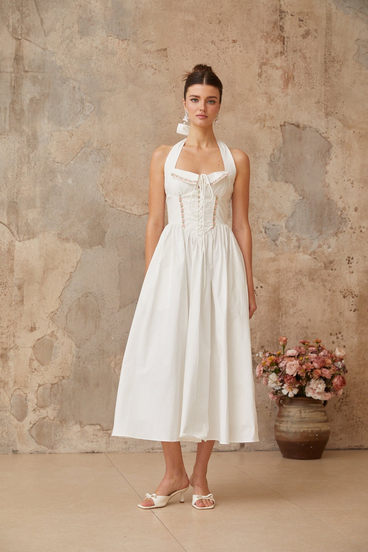 Dulcie white lace-up-detail shirred midi dress