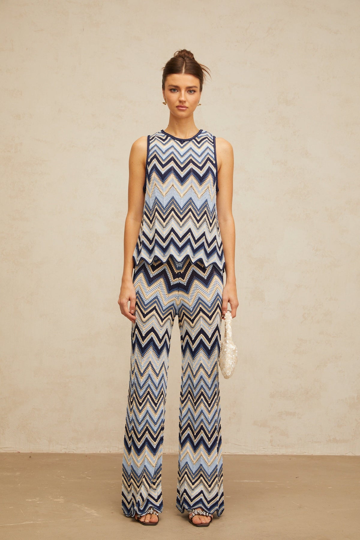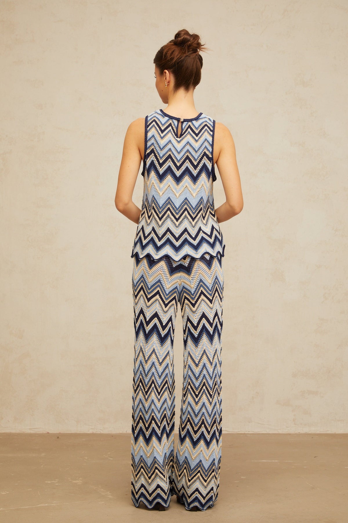 Irina blue zigzag-woven pointelle-knit top & trousers matching set