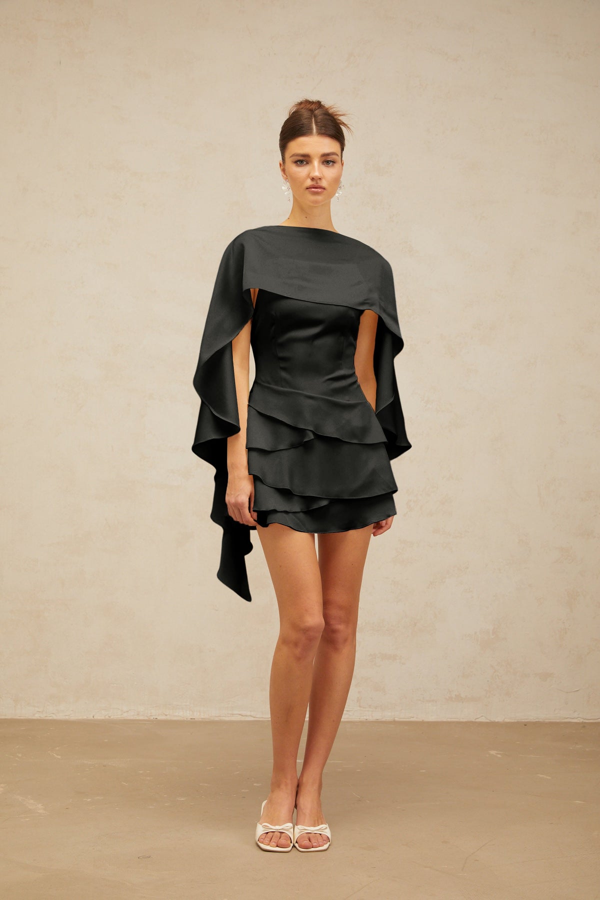 Lyna Black Satin Ruffled Mini Dress with Shawl Panel Detail