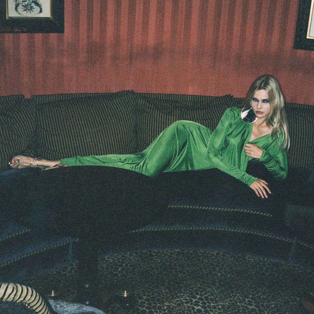 A dreamy, silky, sexy column dress in green with a plunge cowl neckline and closed back. We love styling Octavia with gold accessories, add a skinny heel to emphasise the pavement-grazing length.