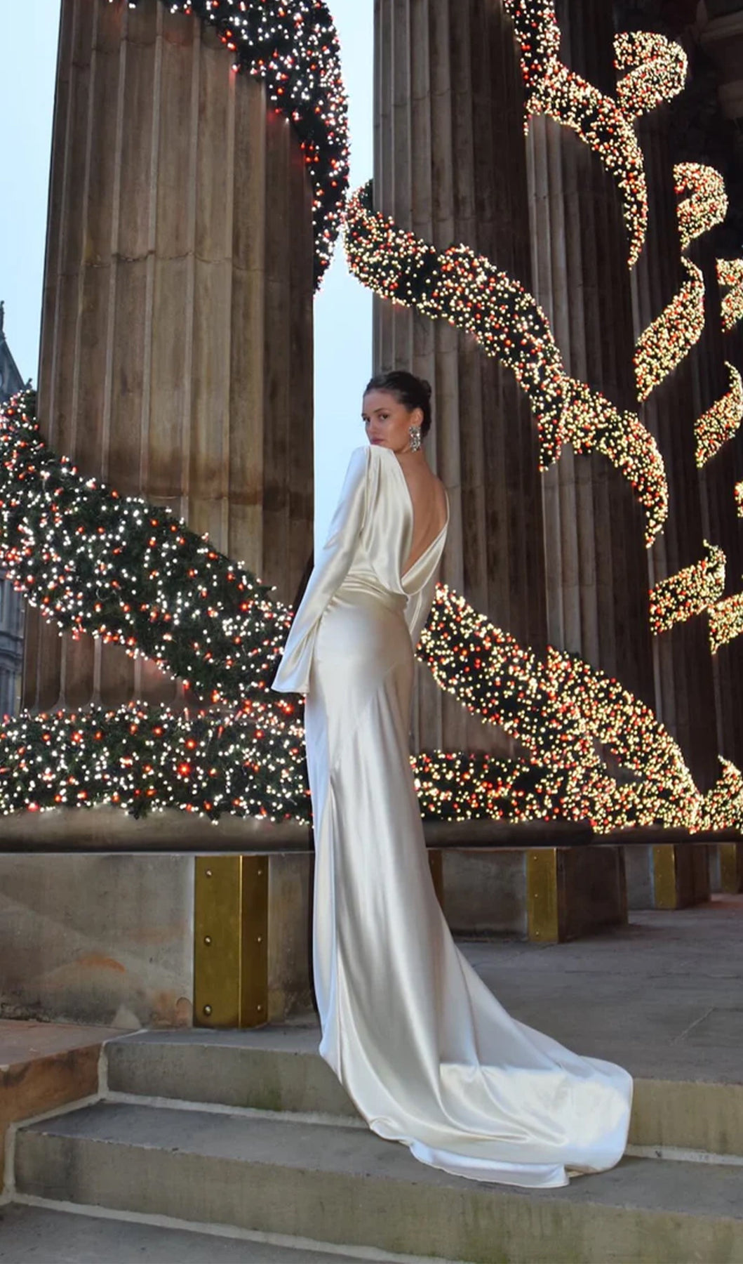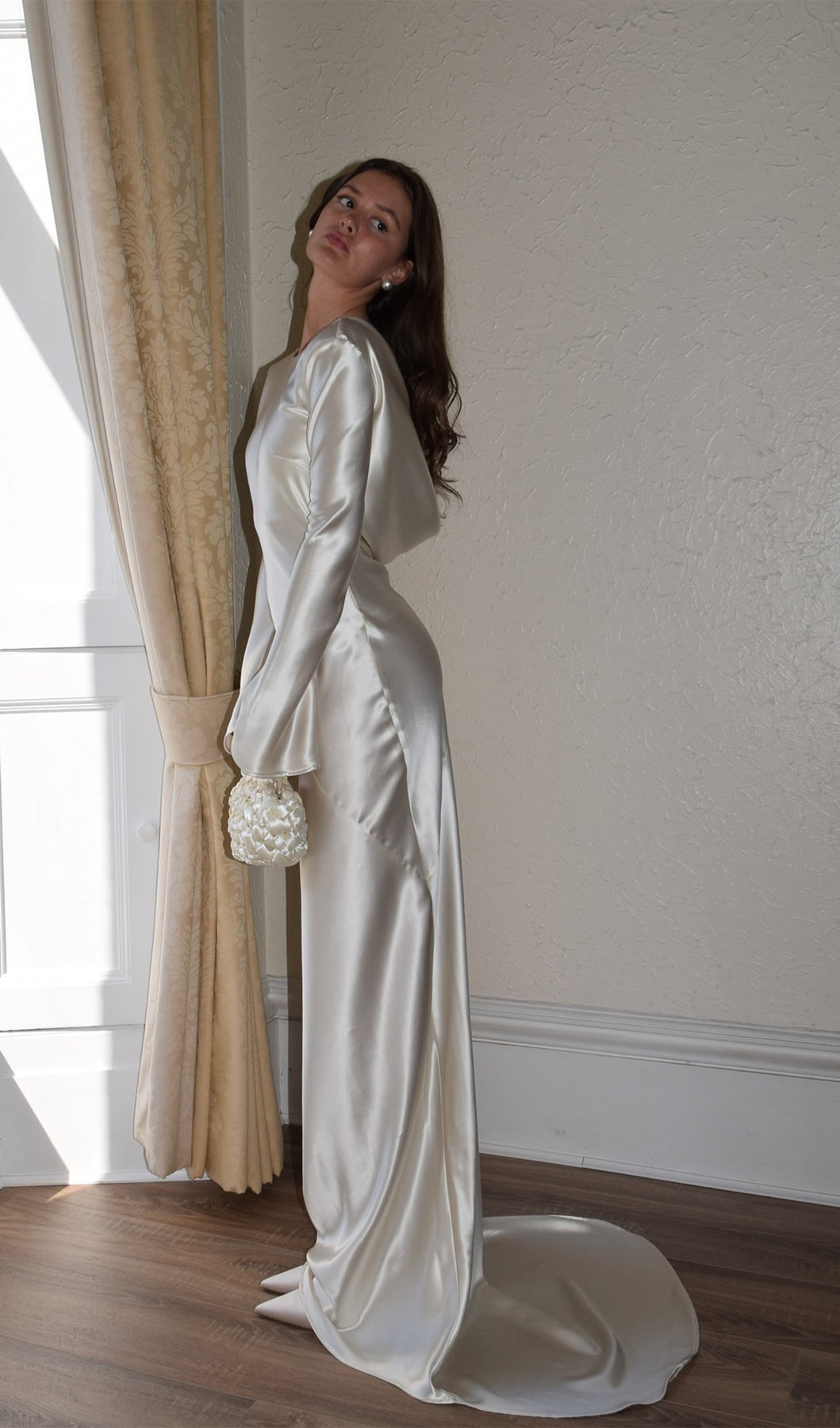 White Satin Long Sleeved Slim Evening Dress