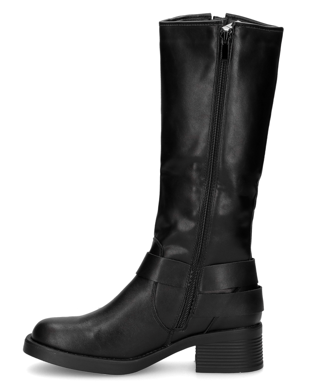 Lo stivale nero SHAKIIRA incarna un'eleganza ribelle e audace. Realizzato in similpelle nera, presenta un design a gambale alto con molteplici fibbie e cinghie che aggiungono un tocco grintoso. Un dettaglio distintivo sono le fibbie metalliche argentate lungo tutto il gambale, che aggiungono un tocco di personalità. La suola è spessa e il tacco è basso e robusto, ideale per un comfort quotidiano e una camminata sicura.